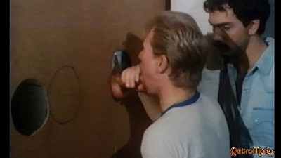 Holt makes his way to a delectable feast for the eyes of a party for the following sequence. The camera lingers over crotches and firm butts encased in denim, roving over the packages on display along with the cruisy eyes of the party-goers. He wanders through the crowd and makes eyes at a few men, soon honing in on an obscenely cute blond fellow whose crop top shows off his hairy belly. These two have a flirtatious exchange and walk off to the corner, where the guy gets on his knees for Holt, segueing into a delirious sequence intercutting sexual displays all across the party! Blondie is a hungry cocksucker, swallowing the meat of several other men (after he mouths Holt), while Holt and another guy suck a dick together through a gloryhole. The blond man winds up sprawled on the floor, surrounded by men in jeans with their dicks out, as he messily shoots a load all over his own face. Meanwhile, Holt and his companion lick up the cum that explodes from the cock they are servicing