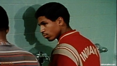 A classic all-black bathroom orgy scene. After some naughty urinal cruising, some eight men end up entangled: fucking, sucking, jerking off, and taking cum in a public men's room. The men pair off in different ways and finally stand around watching two of the guys hump on the bathroom floor. They jerk off to completion, with big cumshots abounding.
